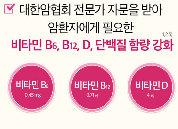 암환자에게 도움을 주는 영양소인 비타민 D, 비타민 B12, 비타민 B, 단백질 등의 성분이 고함량 함유되어 있으며, 비타민과 미네랄, 오메가3 지방산 등 총 26종의 영양소가 포함되어 있습니다. 우리나라 식약처가 2022년 6월 고시한 암환자용 영양조제식품 기준을 충족한 암환자 영양식입니다.