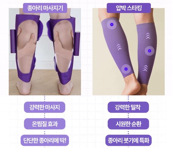 압박밴드 세트에는 마사지 기기와 압박 스타킹이 모두 들어있어 함께 사용하면 더 큰 마사지 효과와 온열 찜질 기능을 경험할 수 있고, 압박 스타킹은 종아리 부분을 꽉 잡아주어 혈액 순환을 개선하고 붓기를 줄이는 데 도움이 됩니다.